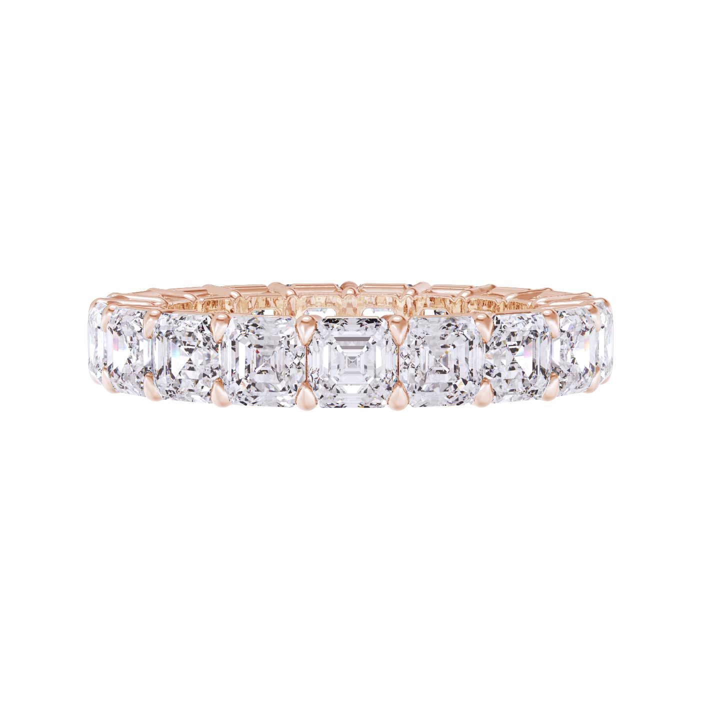 Perfectly matched asscher cut lab grown diamond eternity band set in a shared prong wire basket setting. This ring is roughly 3.5mm wide and each lab grown diamond weighs approximately 0.25 carats each.