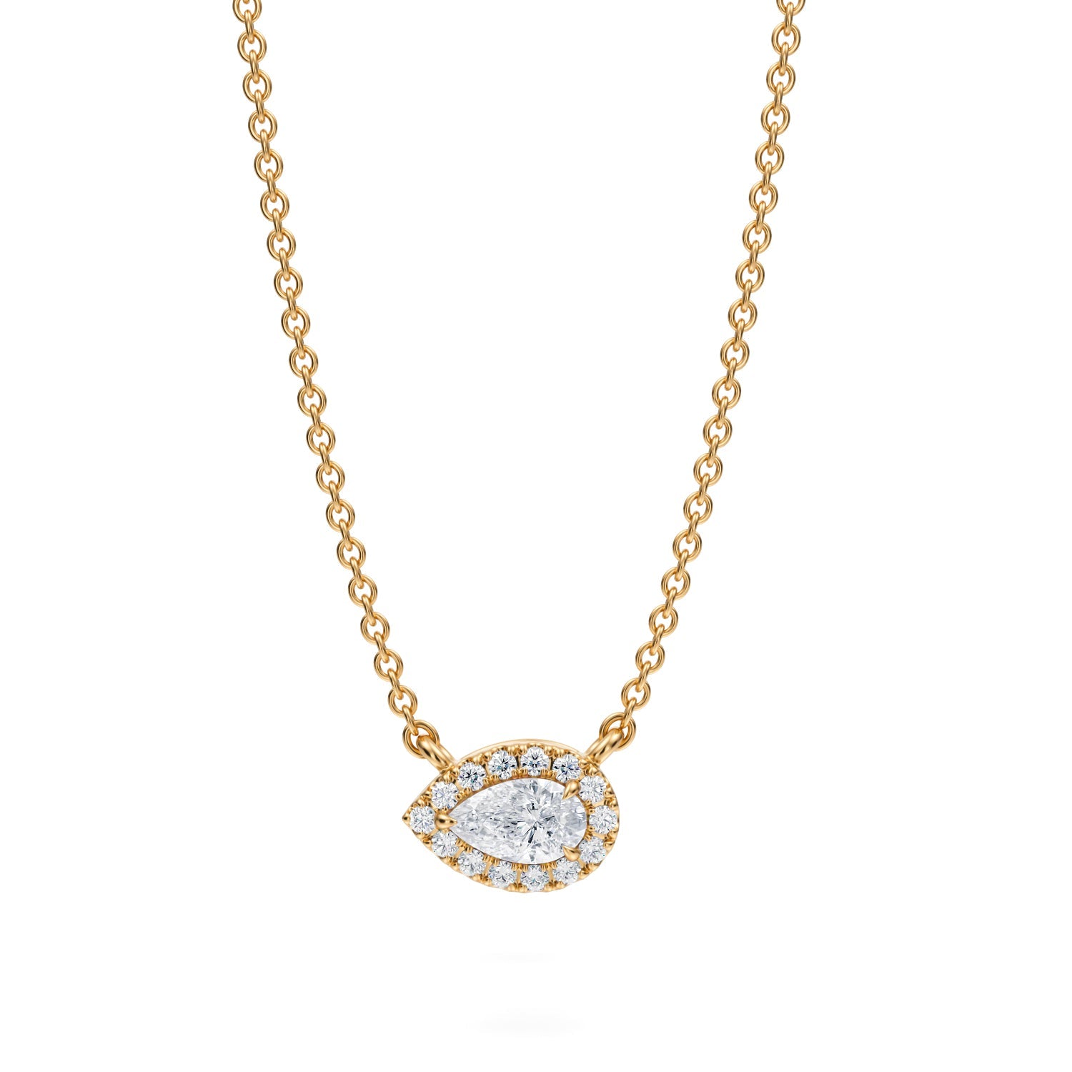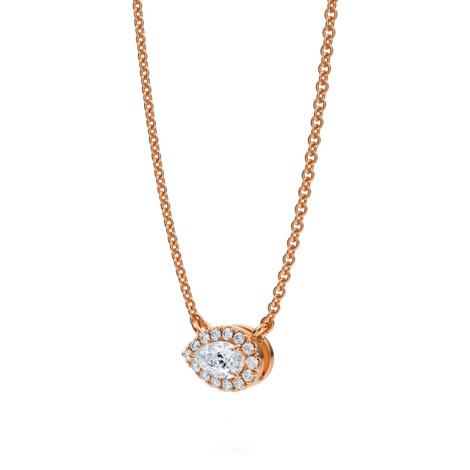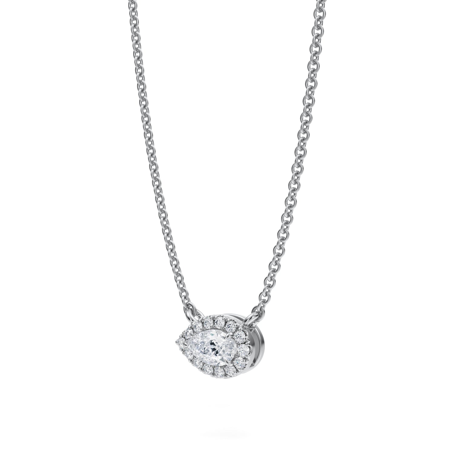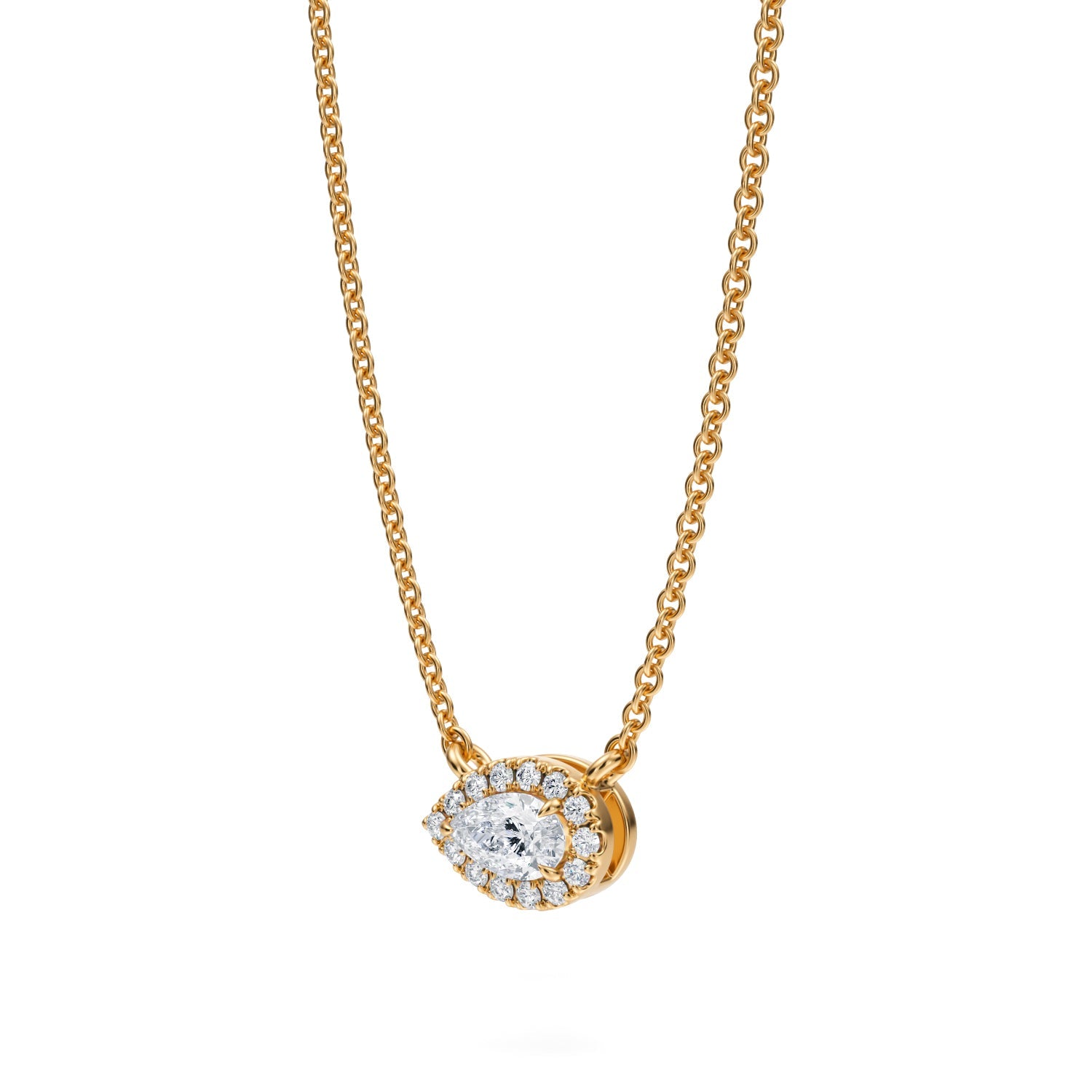 Introducing the elegant Classic Halo Pendant by Michael Gabriels, featuring 1/4 Carat of stunning lab-grown diamonds. This pendant showcases a breathtaking Pear diamond at its center, encircled by a radiant halo of smaller diamonds that enhance its brilliance and allure.